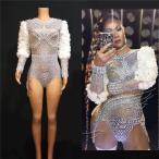 ステージウェアとして重要なのは、やはり見た目のインパクトと動きやすさ。このボディスーツは真珠とラインストーンのフラワーモチーフが散りばめられており、光の当たり方でキラキラと輝くのが特徴です。シルバーのカラーリングが上品でありながらも、華やかさを演出してくれます。特に女性歌手やダンサーが着用すると、照明に反射して美しい存在感を放つでしょう。